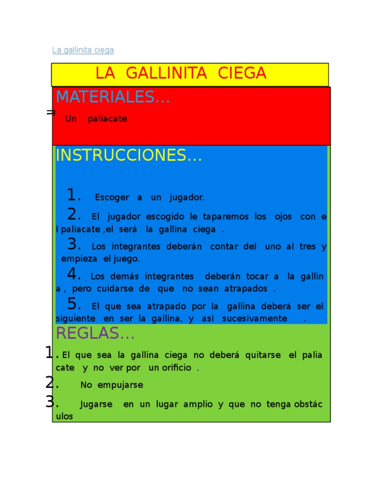Instructivo Del Juego La Gallinita Ciega : Instructivos De Juegos De Courtyard 6 Instructivo De Como Jugar Juegos De Patio : Un sitio lugar, donde no haya obstáculos peligrosos con los que poder tropezar.. Al aire libre, juego muy antiguo de atrapar a algún incauto y adivinar quien es por el tacto. 12 marzo, 2014jugar al aire libreobservatorio del juego. Juegos de habilidad y destreza manual y espacial. Coge un pañuelo y colócalo sobre los ojos de uno de los participantes. Lo único que necesitas son amigos.